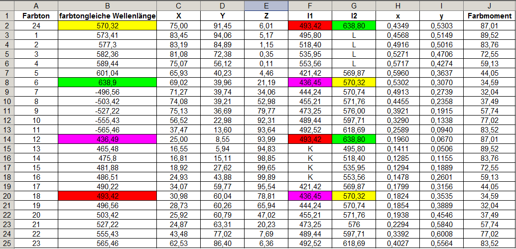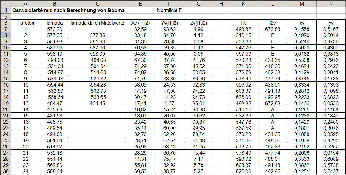 Ich habe diese Tabelle nachgerechnet.Dadurch,daß nicht schon bei der ersten Farbkreisberechnung das System aufgeht, ist ein grosser Rechnungsaufwand erforderlich. In der folgenden Tabelle ist mein eigener Farbkreis (Normlichtart E) wiedergegeben. In diesem System sind zusätzlich zu dem praktizierten Prinzip der Gegenfarben und Farbmischung zusätzliche Eigenschaften vorhanden, die Ostwald für seinen Farbkreis gefordert hat. Sein eigener ausgeführter Farbkreis entspricht den Forderungen nur teilweise.